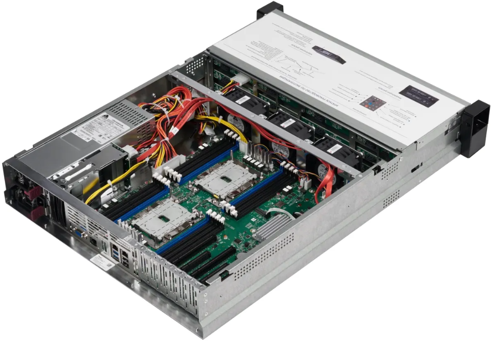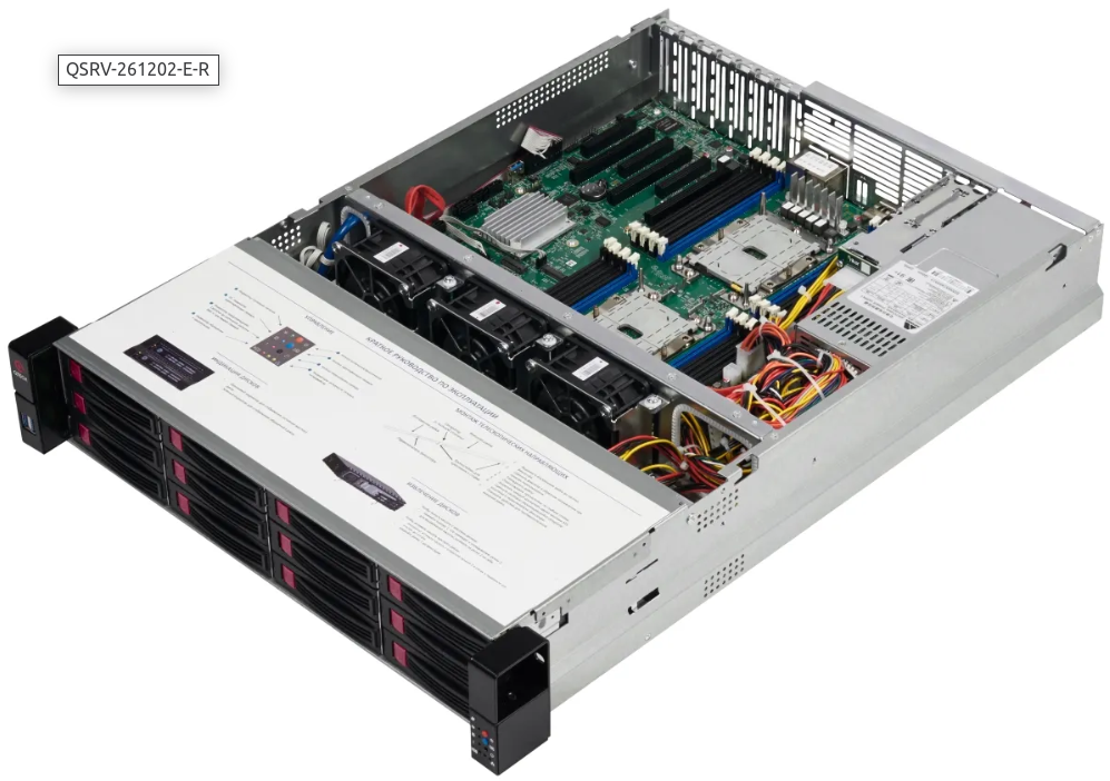 Серверы построены на основе платформы QSRV-261202-E-R 2U; (12×3.5 HDD SATA/SAS 3.0 (поддерживает 2.5') ActiveBP + 2×2.5” rear bay’s; 2×Intel SL (LGA 3647 max 205 Вт TDP); 16×DDR4; SW RAID 0,1 & 10; 1×M.2 PCIe x4; 1×M.2 SATA; 2×800 Вт (1+1); 4×1GbE LAN; 1х8 PCIe + 5x16 HHHL; IPMI; Rails)