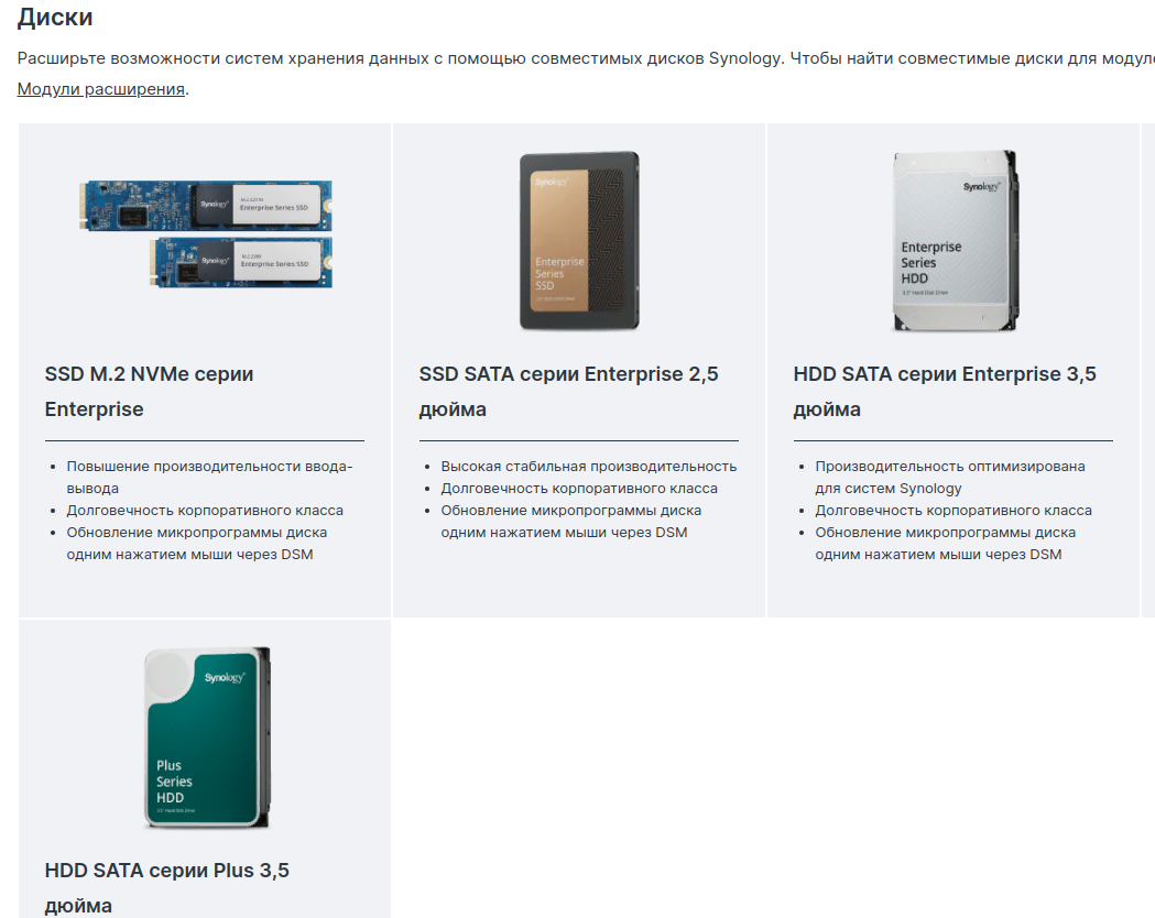 Модули расширения - lобавьте дополнительные отсеки для дисков в систему хранения с помощью совместимых модулей расширения. Чтобы найти запасные части, диски и принадлежности для модулей расширения, перейдите в раздел