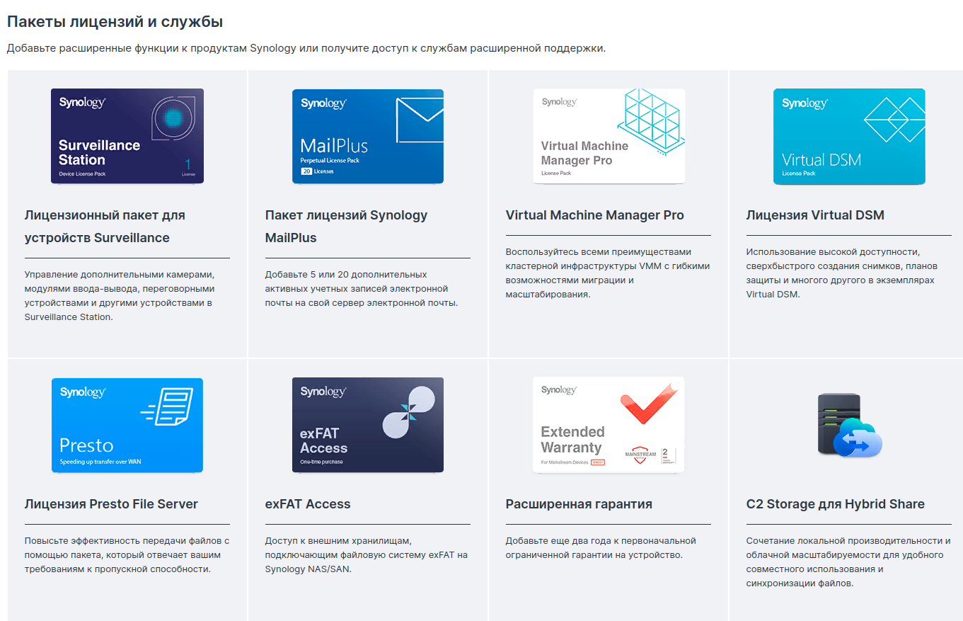 Добавьте расширенные функции к продуктам Synology или получите доступ к службам расширенной поддержки.